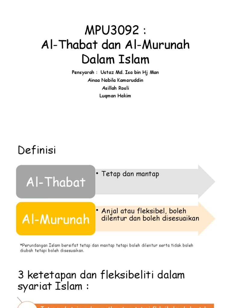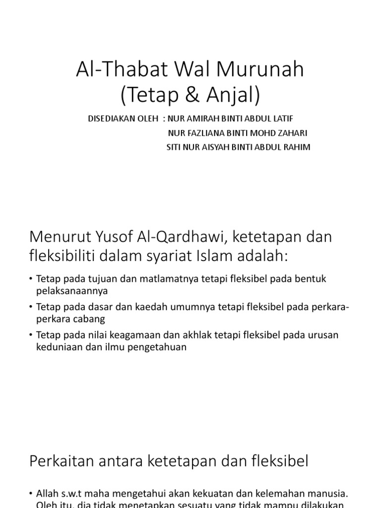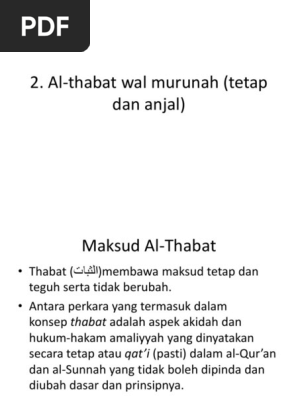Konsep Thabat merangkumi aspek akidah dan hukum hakam amaliyyah yang dinyatakan dalam Al-quran. View Al-Thabat Wal Murunah Amalan Syariat Qatie Sesuai Masa Tempatpptx from PENDIDIKAN ISLAM at IPG Kampus Bahasa Melayu. Hakikatnya konsep Murunah dan Thabat ini saling berkaitan antara satu sama lain dan sekaligus menunjukkan bahawa ajaran Islam amat sesuai dengan sifat semulajadi manusia.